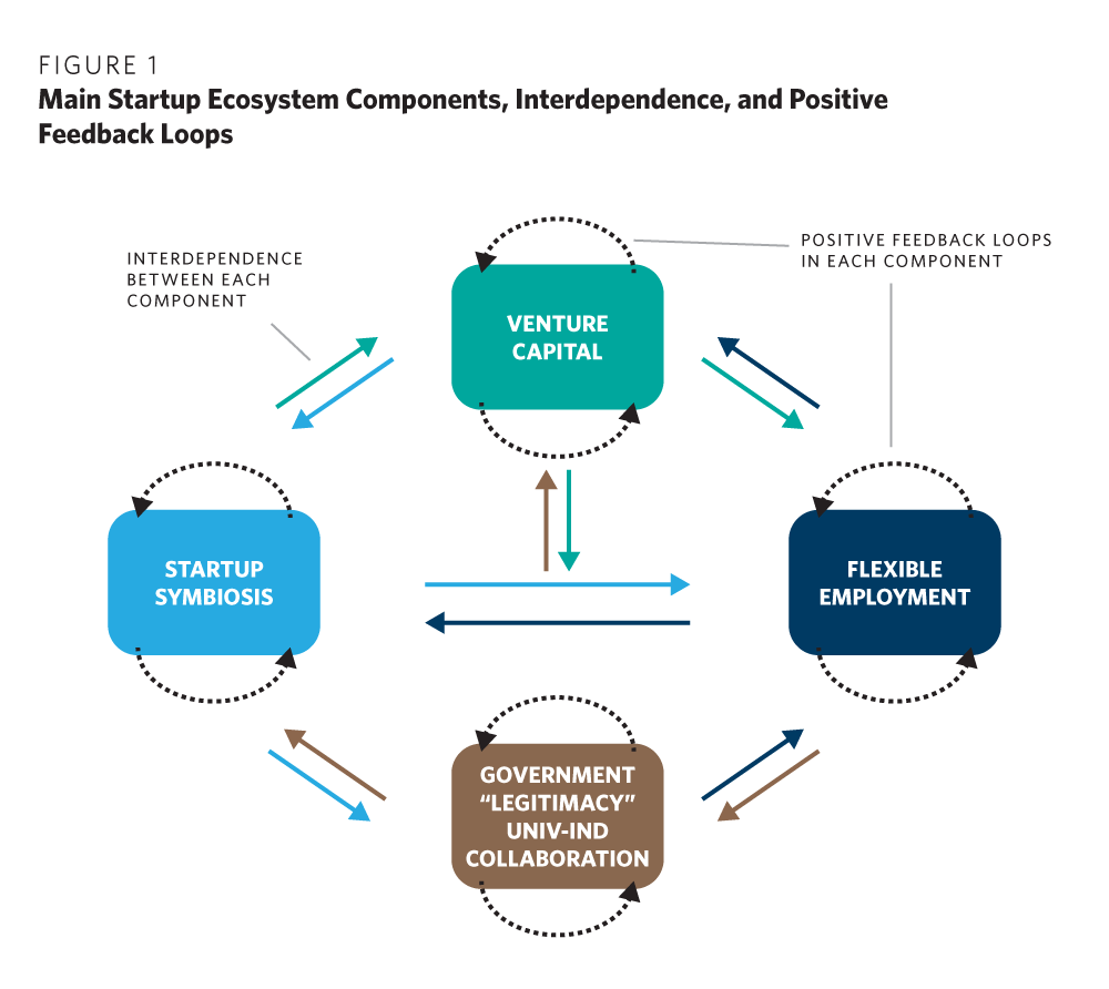 Startup ecosystems have several components. These components are interlocking, in that each depends on others to function.